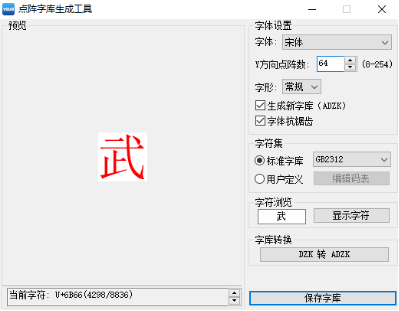 勾選,將以ADZK格式保存字庫(kù)數(shù)據(jù),生成的字庫(kù)文件的后綴為ADZK。目前僅SDWb系列支持該格式字庫(kù)。否則生成DZK格式字庫(kù)。