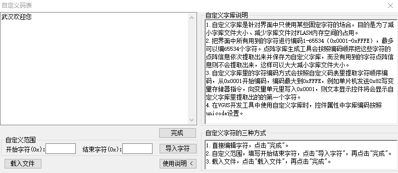 選擇所需字符集,即字庫(kù)的編碼方式??蛇xASCII、BIG5、GB2312、GBK、SJIS、UNICODE。對(duì)于僅需要部分字符的字庫(kù),用戶可自定義編碼表。詳細(xì)使用方法參考《多語種、大容量字庫(kù)的應(yīng)用技巧.pdf》。 |
