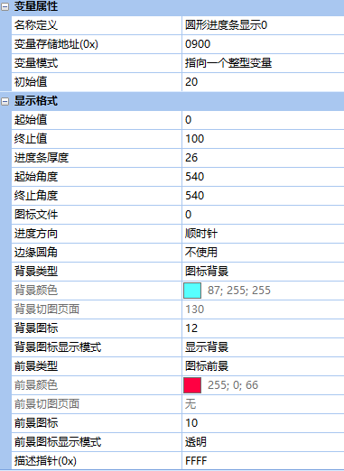 在VGUS組態(tài)軟件中,控件位置為:變量配置->圓形進度條顯示。